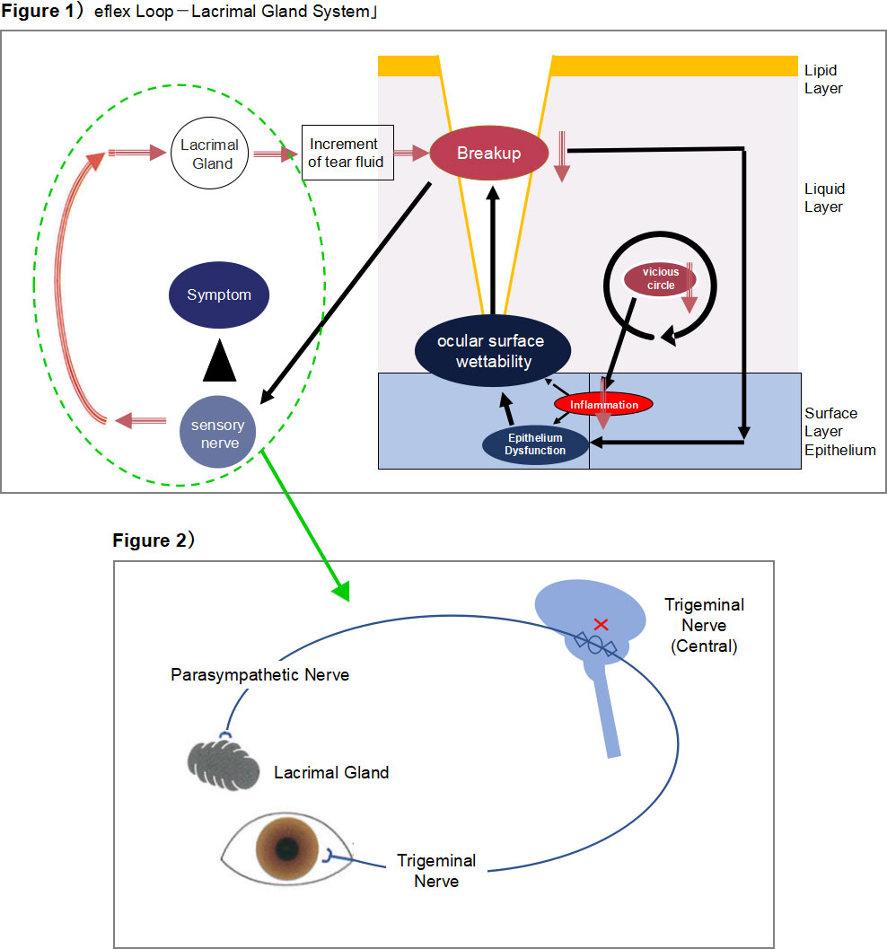 이 반사성 눈물 분비는 삼차신경-부교감신경으로 이루어진 긴 신경 루프와 눈물샘에 의해 구성되며, Reflex Loop-눈물샘 시스템이라고 불립니다.
